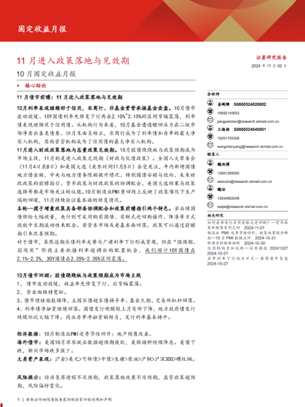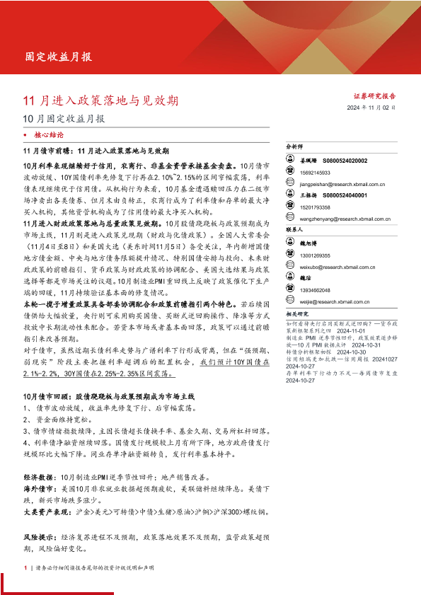 【西部证券】【20241102】10月固定收益月报:11月进入政策落地与见效期-24页