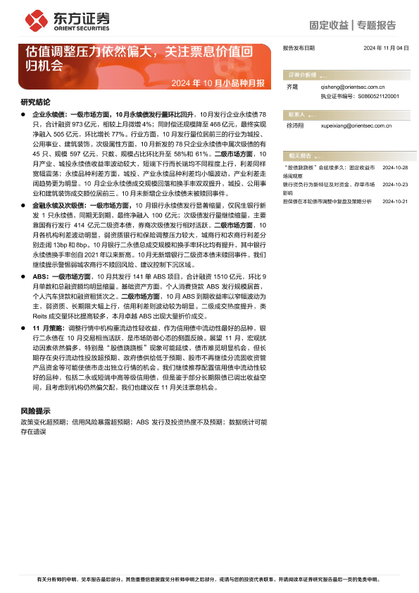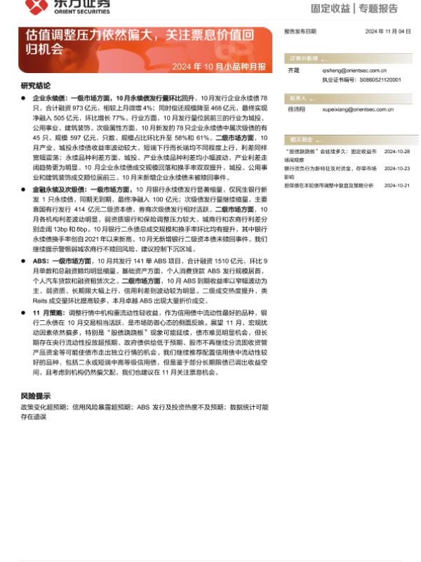 【东方证券】【20241104】2024年10月小品种月报:估值调整压力依然偏大,关注票息价值回归机会-18页