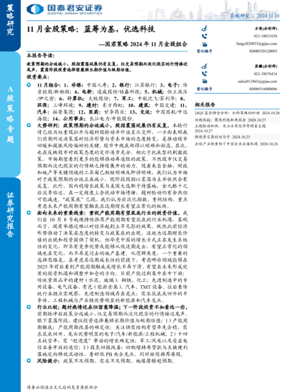 【国泰君安证券】【20241101】2024年11月金股组合-11月金股策略:蓝筹为基,优选科技-33页