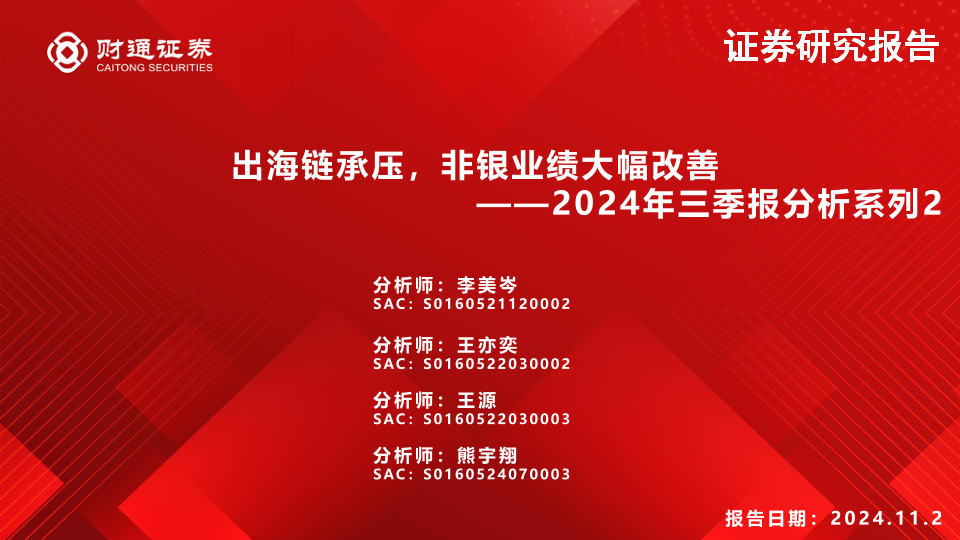 【财通证券】【20241102】2024年三季报分析系列2:出海链承压,非银业绩大幅改善-15页