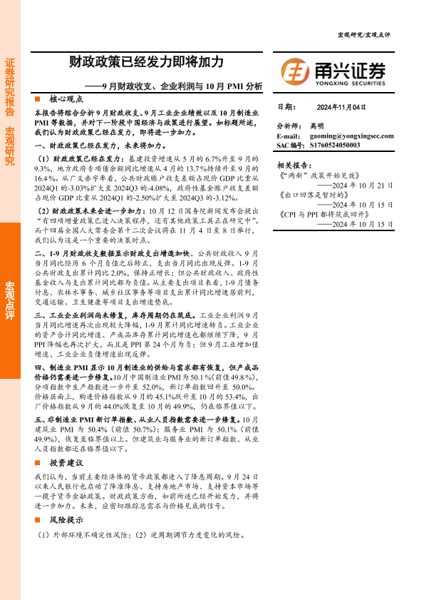 【甬兴证券】【20241104】9月财政收支、企业利润与10月PMI分析:财政政策已经发力即将加力-11页