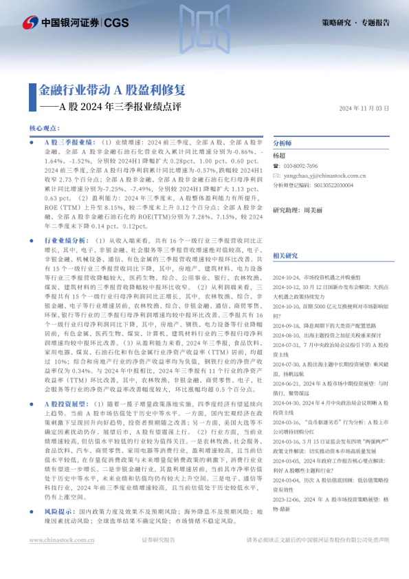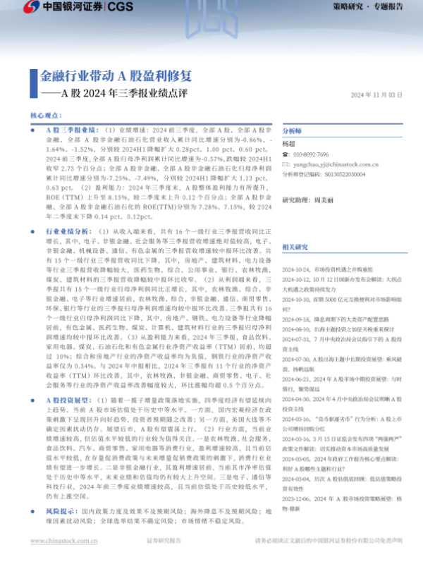 【银河证券】【20241103】A股2024年三季报业绩点评:金融行业带动A股盈利修复-24页