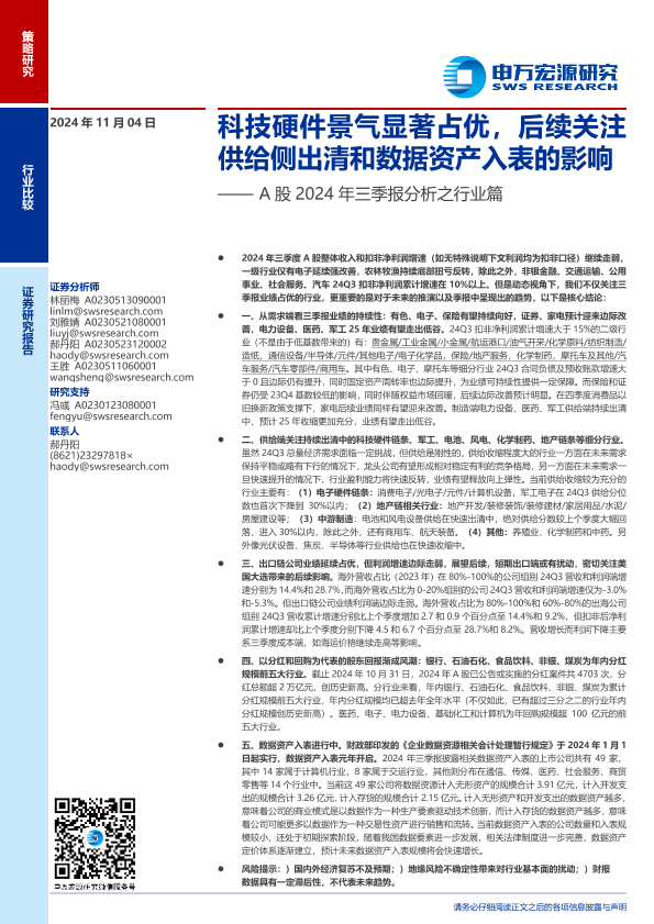 A股三季报 供给侧改革 数据资产入表 科技硬件 行业分析