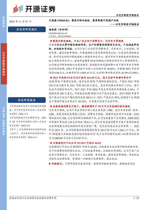 【开源证券】【20241107】万源通(920060)北交所新股申购报告:聚焦印制电路板,募资新建中高端产品线-20页