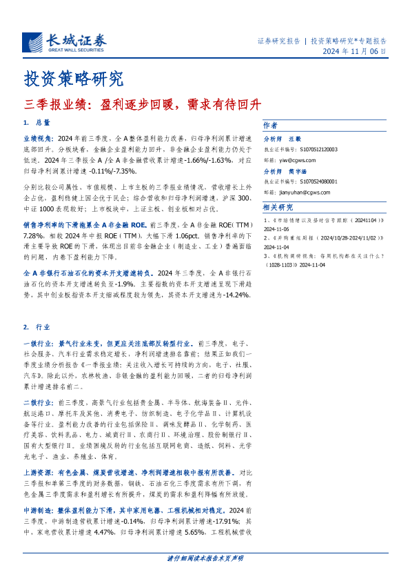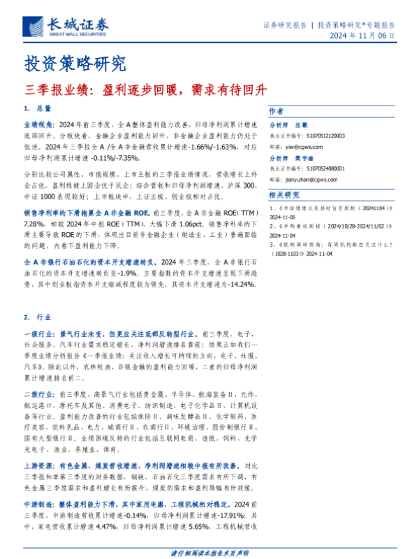 【长城证券】【20241106】三季报业绩:盈利逐步回暖,需求有待回升-26页