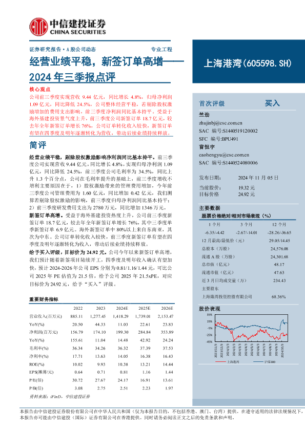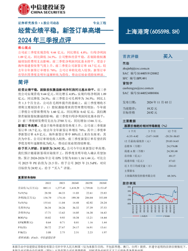 【中信建投证券】【20241105】上海港湾(605598)2024年三季报点评:经营业绩平稳,新签订单高增-11页