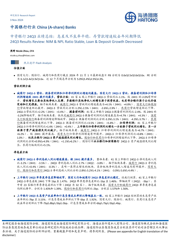 【海通国际】【20241103】中国银行行业中资银行24Q3业绩总结:息差及不良率平稳,存贷款增速较去年同期降低-12页