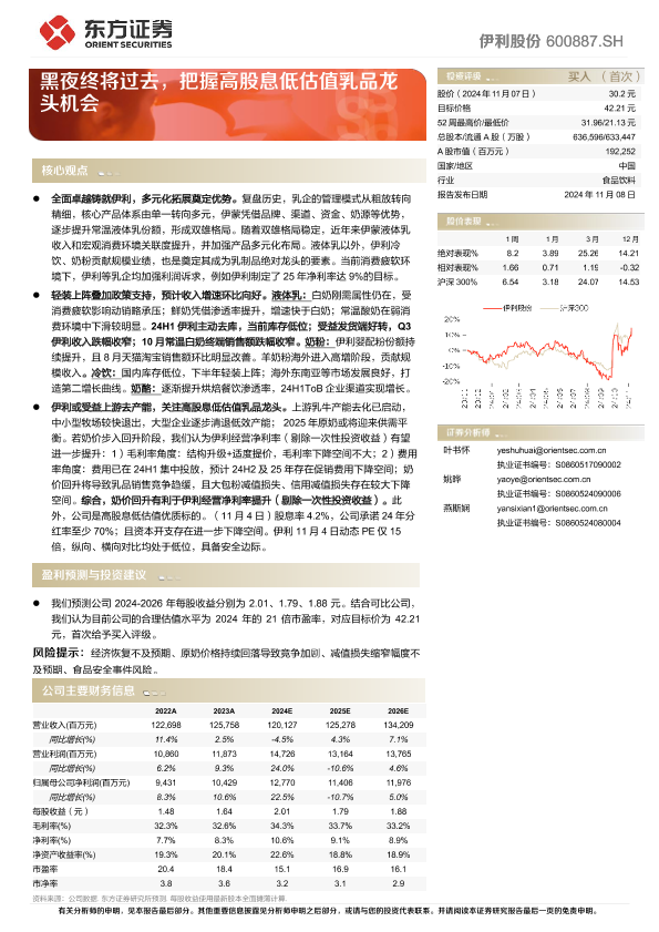 【东方证券】【20241108】伊利股份(600887)黑夜终将过去,把握高股息低估值乳品龙头机会-30页
