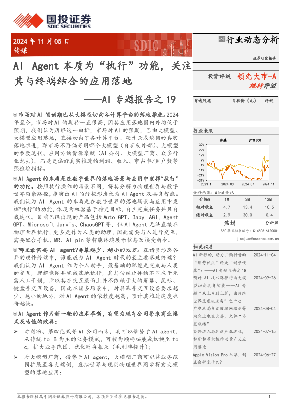 【国投证券】【20241105】传媒行业AI专题报告之19:AI+Agent本质为“执行”功能,关注其与终端结合的应用落地-10页