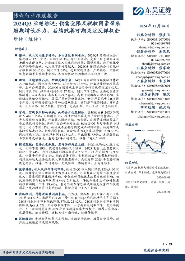 【东吴证券】【20241104】传媒行业深度报告:2024Q3业绩综述,供需受限及税收因素带来短期增长压力,后续改善可期关注反弹机会-29页