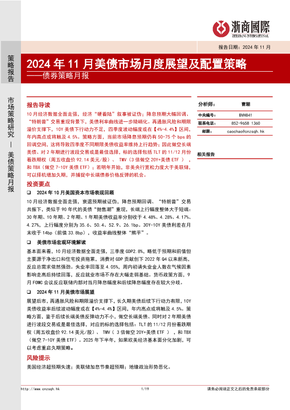 【浙商国际】【20241104】债券策略月报:2024年11月美债市场月度展望及配置策略-19页