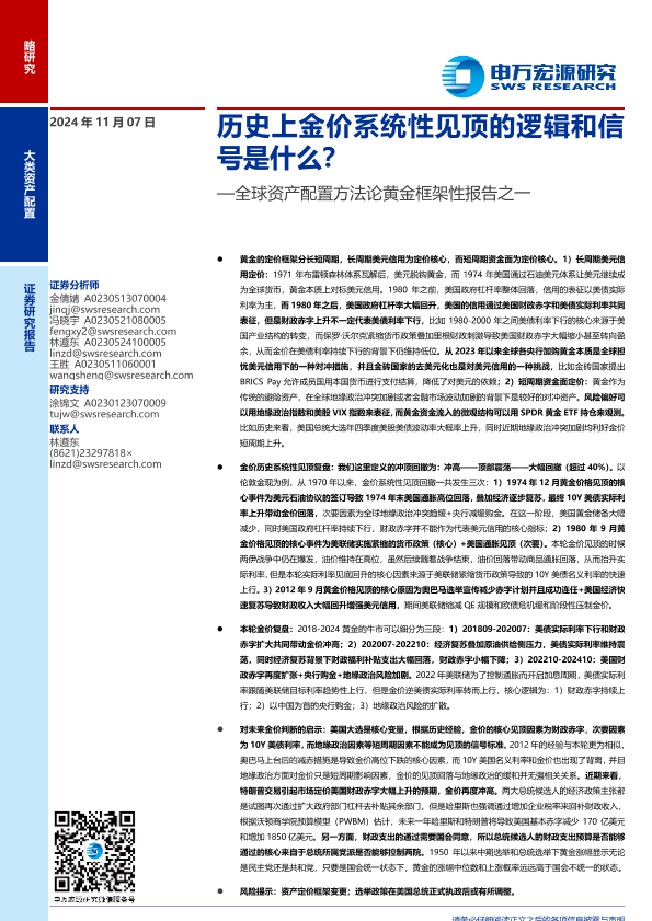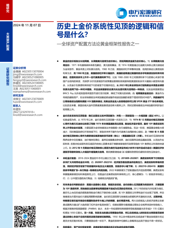 【申万宏源】【20241107】全球资产配置方法论黄金框架性报告之一:历史上金价系统性见顶的逻辑和信号是什么?-37页