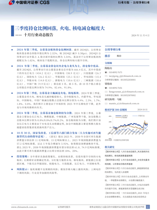 【银河证券】【20241104】公用事业行业十月行业动态报告:三季度持仓比例回落,火电、核电减仓幅度大-20页