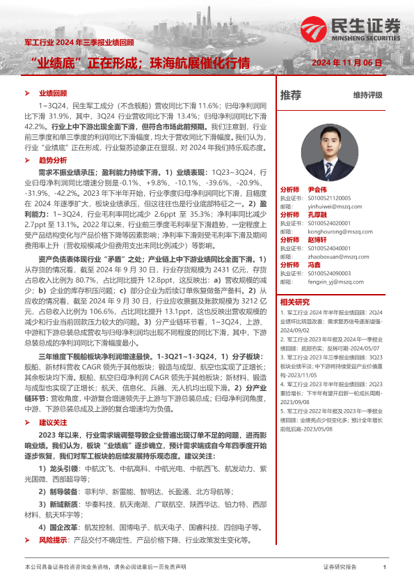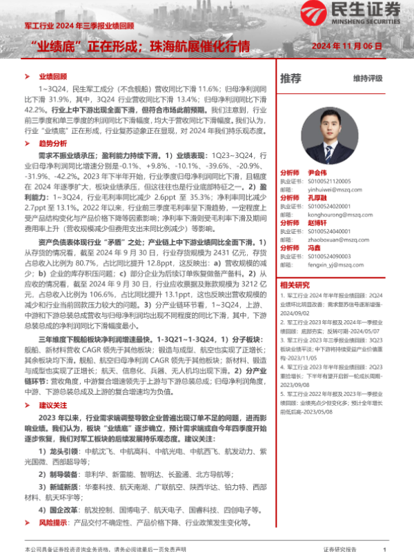 【民生证券】【20241106】军工行业2024年三季报业绩回顾:“业绩底”正在形成;珠海航展催化行情-17页