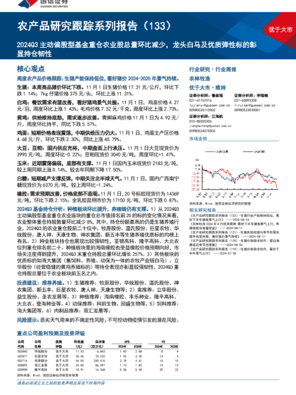 【国信证券】【20241103】农产品研究跟踪系列报告(133):2024Q3主动偏股型基金重仓农业股总量环比减少,龙头白马及优质弹性标的彰显持仓韧性-32页