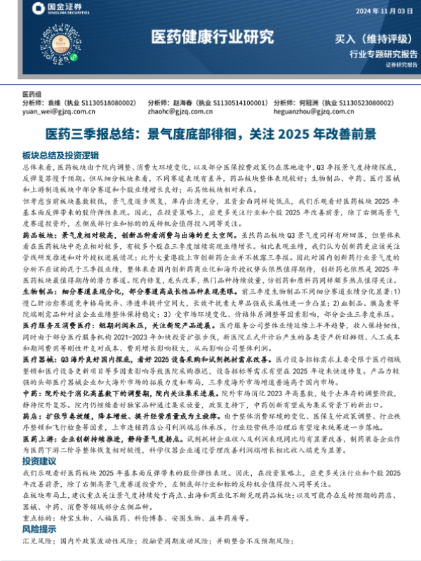 2025展望 三季报 医药健康 投资策略 行业分析