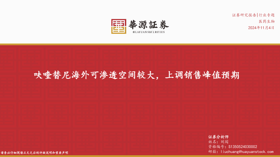 【华源证券】【20241104】医药生物行业专题:呋喹替尼海外可渗透空间较大,上调销售峰值预期-15页