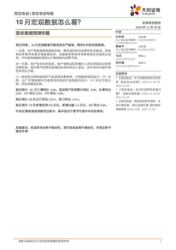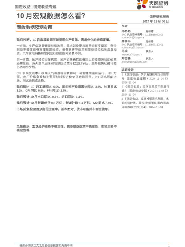 【天风证券】【20241106】固收数据预测专题:10月宏观数据怎么看?-16页