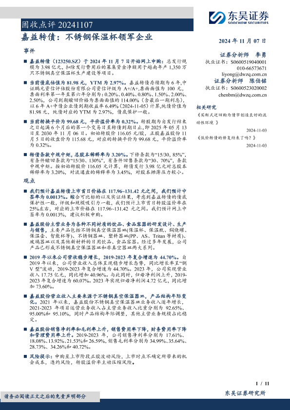 【东吴证券】【20241107】固收点评:嘉益转债,不锈钢保温杯领军企业-11页