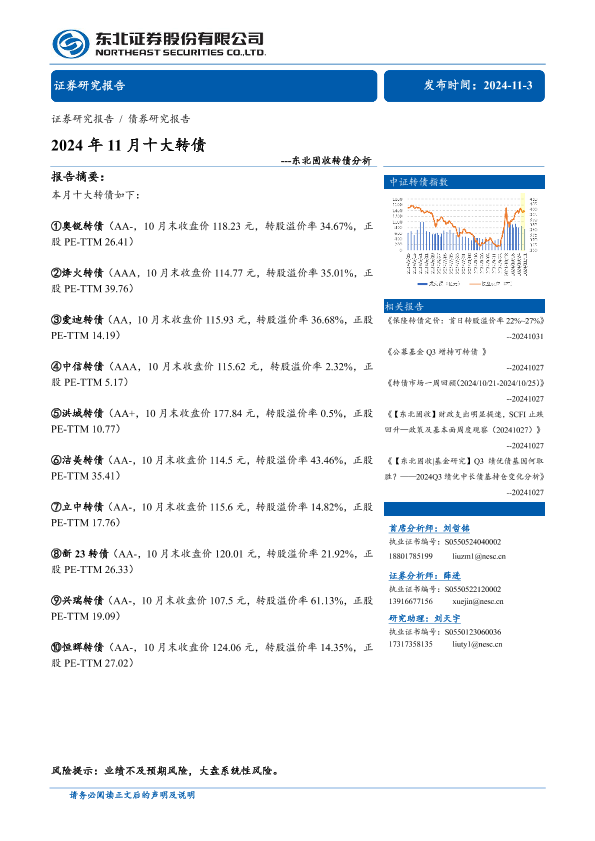 【东北证券】【20241103】固收转债分析:2024年11月十大转债-27页