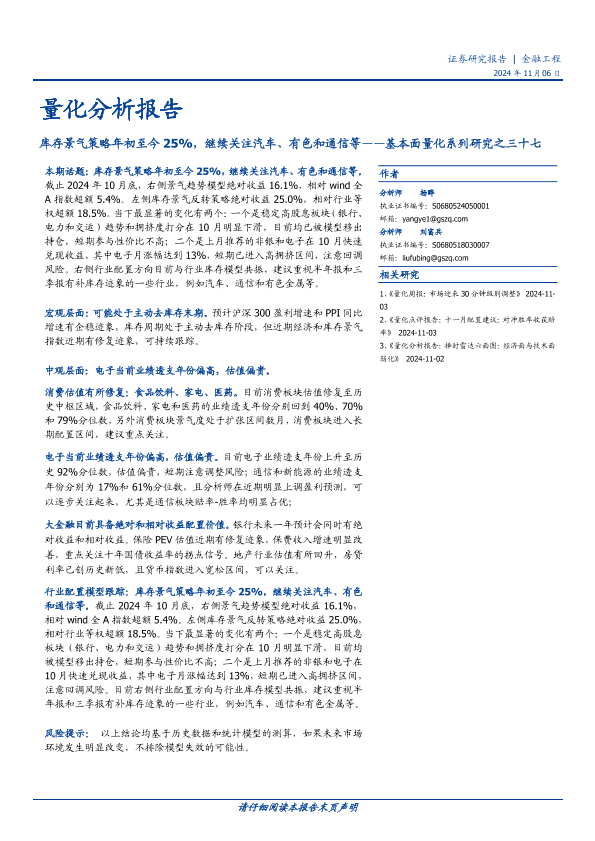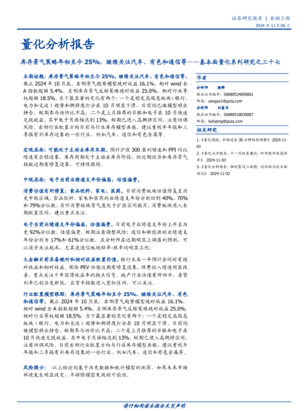 【国盛证券】【20241106】基本面量化系列研究之三十七:库存景气策略年初至今25%,继续关注汽车、有色和通信等-22页