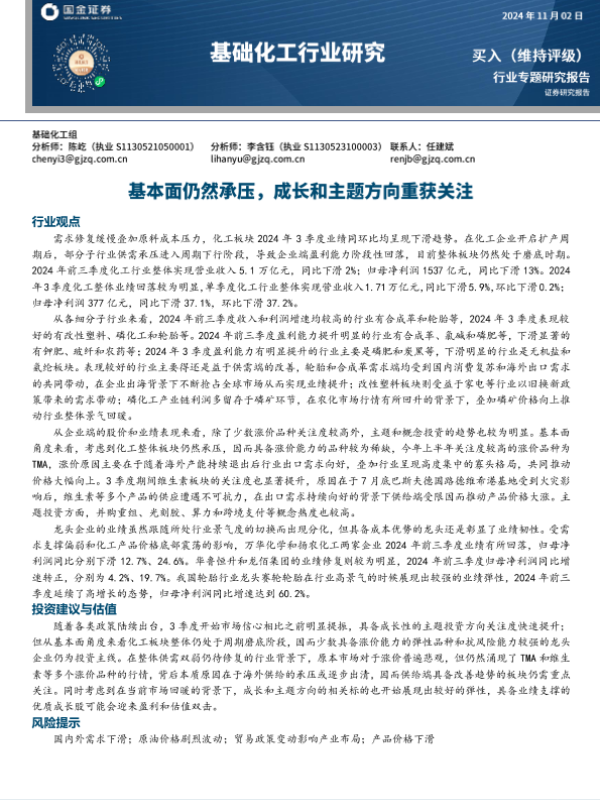 【国金证券】【20241102】基础化工行业专题研究报告:基本面仍然承压,成长和主题方向重获关注-46页