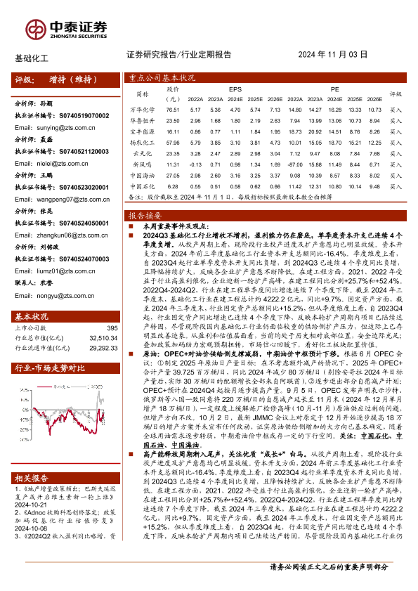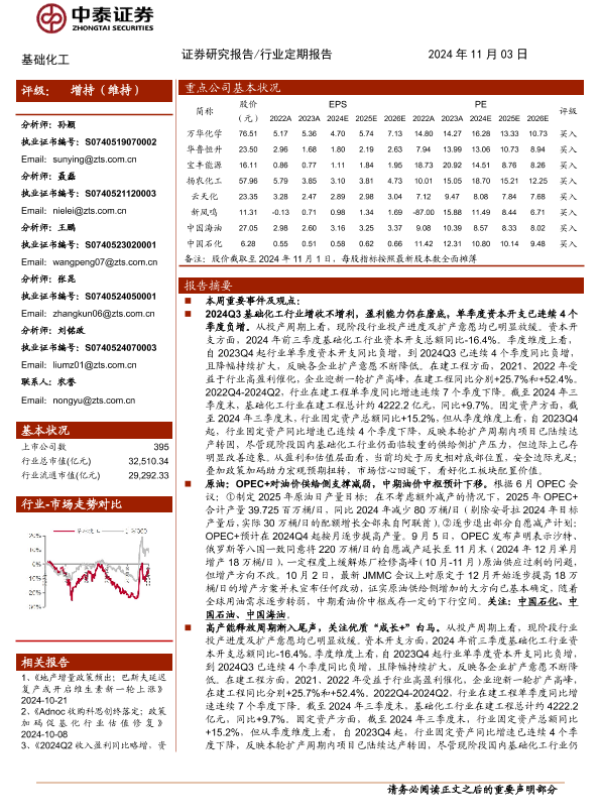 【中泰证券】【20241103】基础化工行业:三季度化工整体仍承压;资本开支连续四个季度同比负增-35页