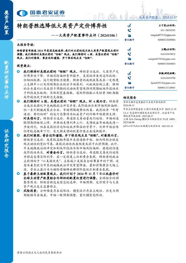 【国泰君安证券】【20241107】大类资产配置事件点评:特朗普胜选降低大类资产定价博弈性-16页