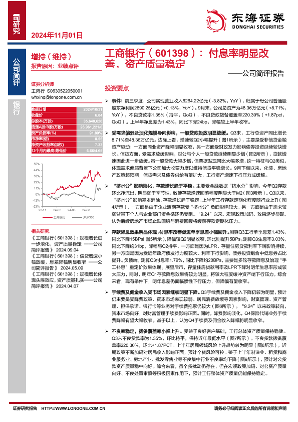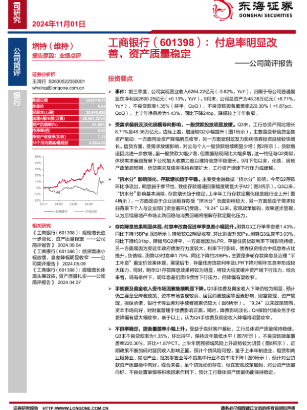 【东海证券】【20241101】工商银行(601398)公司简评报告:付息率明显改善,资产质量稳定-10页