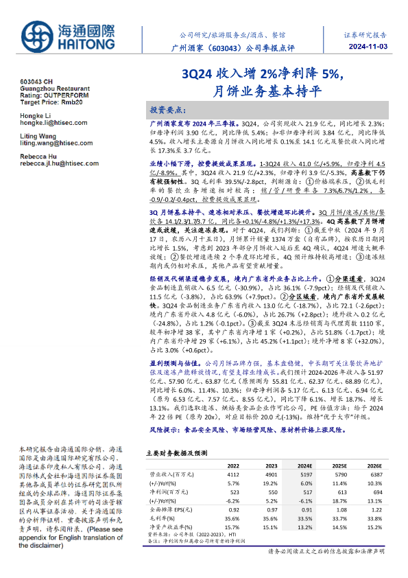 【海通国际】【20241103】广州酒家(603043)3Q24收入增2%25净利降5%25,月饼业务基本持平-12页