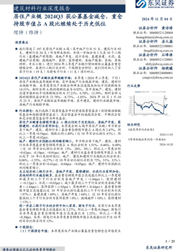 【东吴证券】【20241104】建筑材料行业深度报告:居住产业链2024Q3获公募基金减仓,重仓持股市值占A股比继续处于历史低位-23页