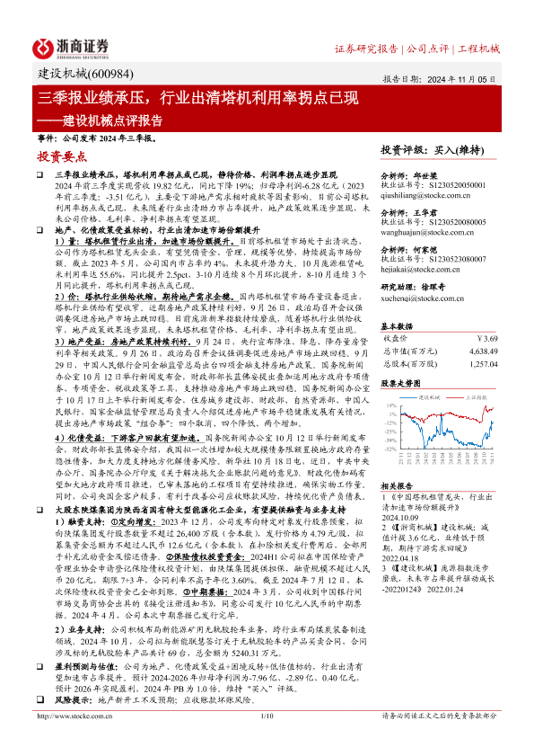 【浙商证券】【20241105】建设机械(600984)点评报告:三季报业绩承压,行业出清塔机利用率拐点已现-10页