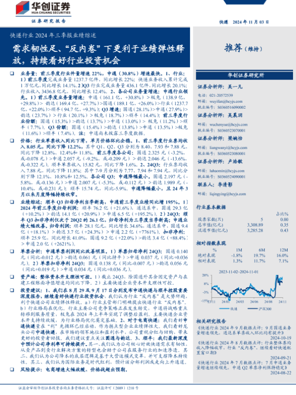 【华创证券】【20241103】快递行业2024年三季报业绩综述:需求韧性足、“反内卷”下更利于业绩弹性释放,持续看好行业投资机会-17页