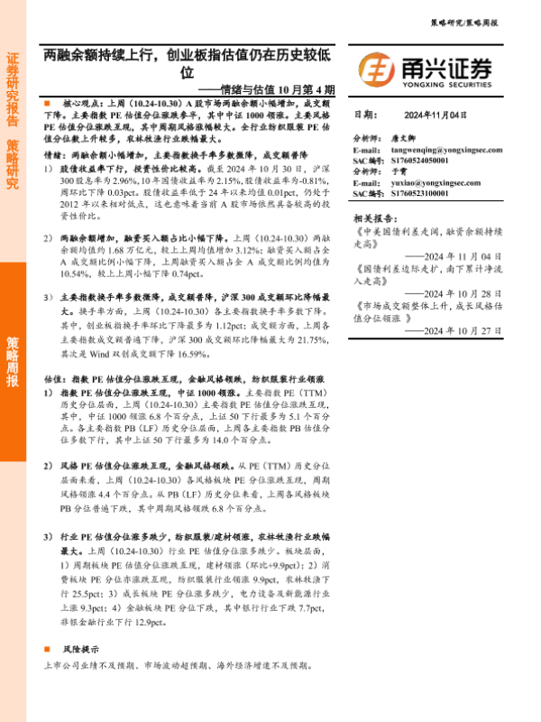 【甬兴证券】【20241104】情绪与估值10月第4期:两融余额持续上行,创业板指估值仍在历史较低位-10页
