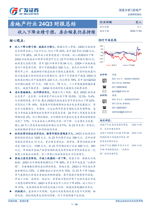 【广发证券】【20241105】房地产行业24Q3财报总结:收入下降业绩亏损,房企缩表仍在持续-29页