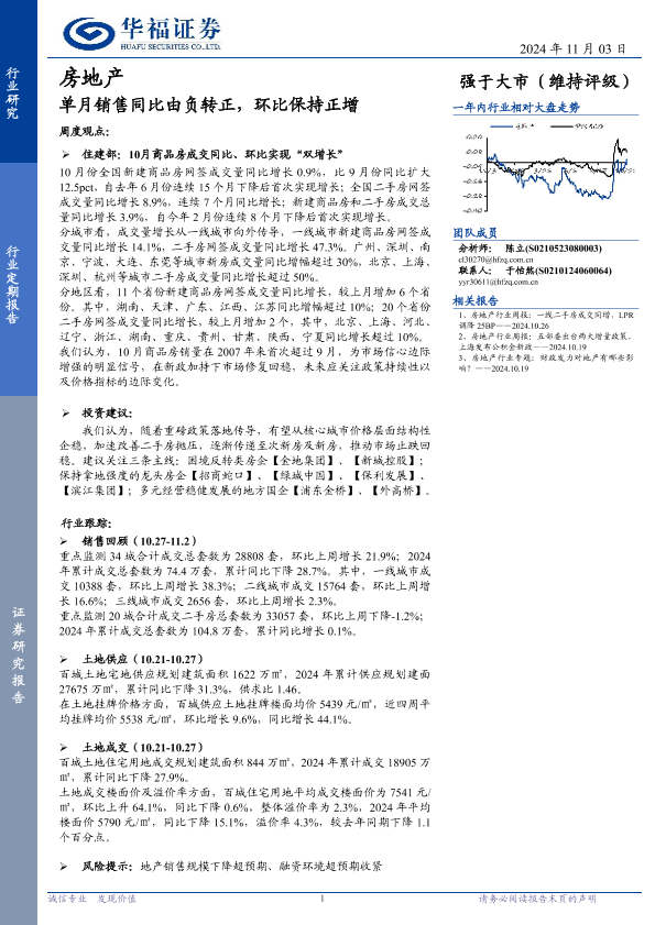 【华福证券】【20241103】房地产行业定期报告:单月销售同比由负转正,环比保持正增-14页