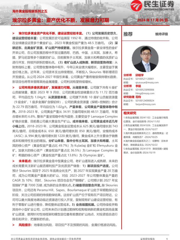 【民生证券】【20241106】海外黄金股观察系列之五:埃尔拉多黄金,资产优化不断,发展潜力可期-26页