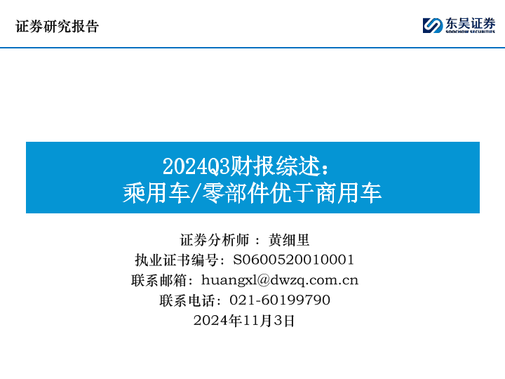 【东吴证券】【20241103】汽车行业2024Q3财报综述:乘用车/零部件优于商用车-72页