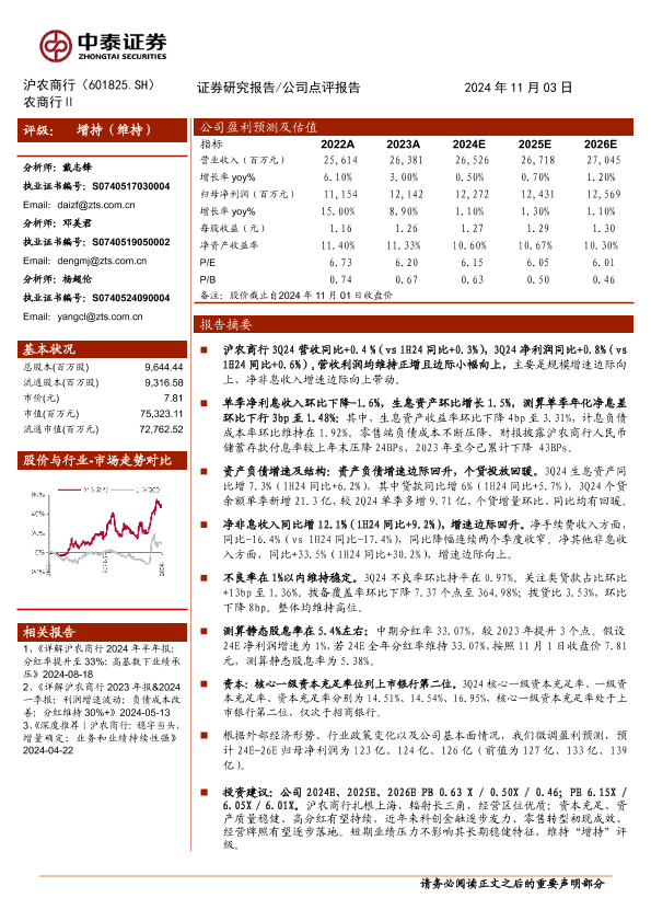 2024三季报 业绩增速 个贷增长 沪农商行 资产质量