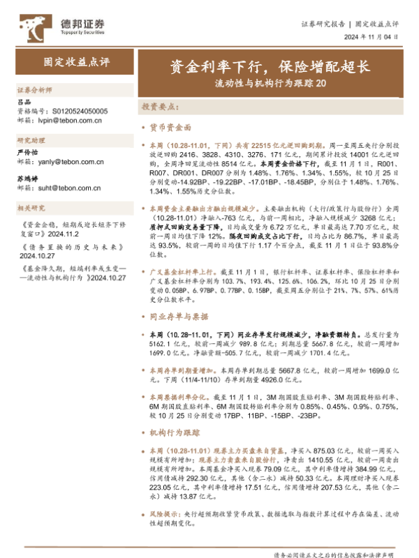 【德邦证券】【20241104】流动性与机构行为跟踪20:资金利率下行,保险增配超长-18页