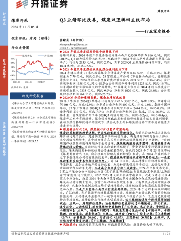 【开源证券】【20241105】煤炭开采行业深度报告:Q3业绩环比改善,煤炭双逻辑四主线布局-21页