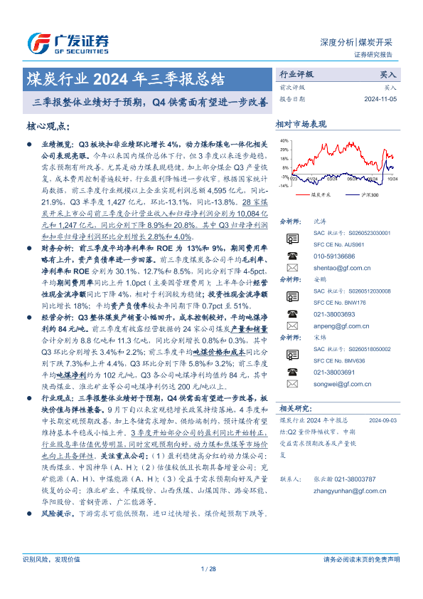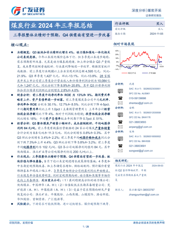 【广发证券】【20241105】煤炭行业2024年三季报总结:三季报整体业绩好于预期,Q4供需面有望进一步改善-28页