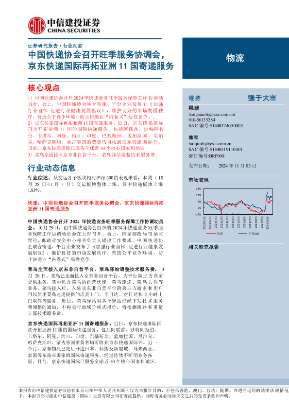 【中信建投证券】【20241103】物流行业:中国快递协会召开旺季服务协调会,京东快递国际再拓亚洲11国寄递服务-17页