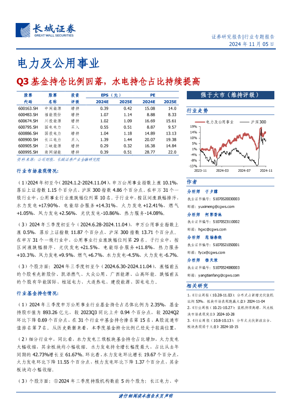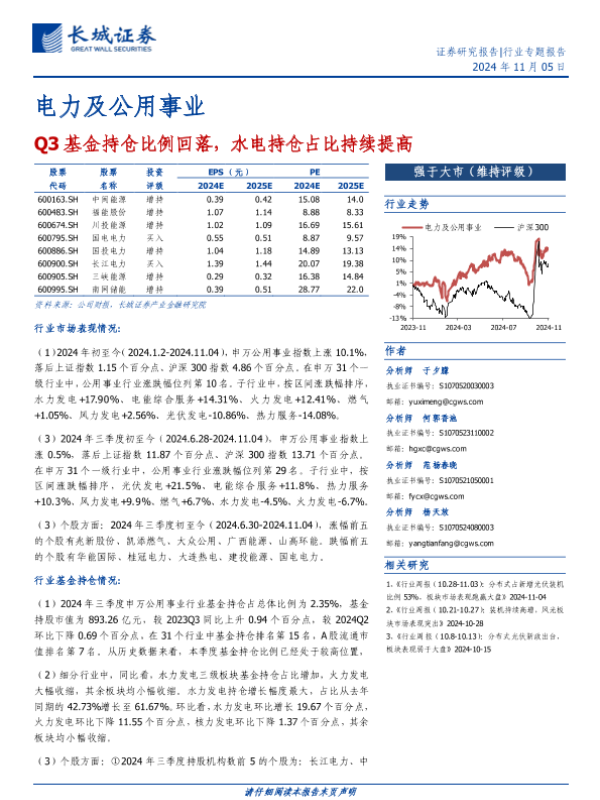 【长城证券】【20241105】电力及公用事业行业:Q3基金持仓比例回落,水电持仓占比持续提高-14页