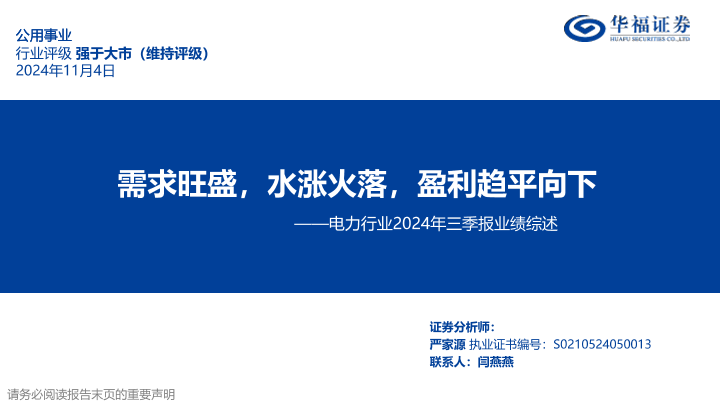 【华福证券】【20241104】电力行业2024年三季报业绩综述:需求旺盛,水涨火落,盈利趋平向下-21页