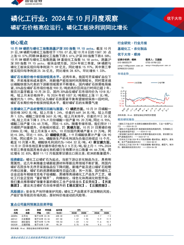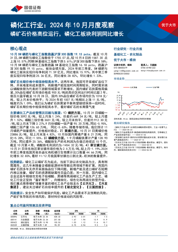 【国信证券】【202410】磷化工行业:2024年10月月度观察,磷矿石价格高位运行,磷化工板块利润同比增长-27页