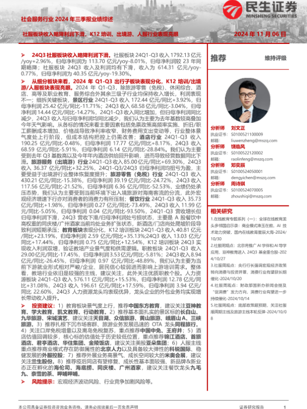 【民生证券】【20241106】社会服务行业2024年三季报业绩综述:社服板块收入略降利润下滑,K12培训、出境游、人服行业表现亮眼-36页