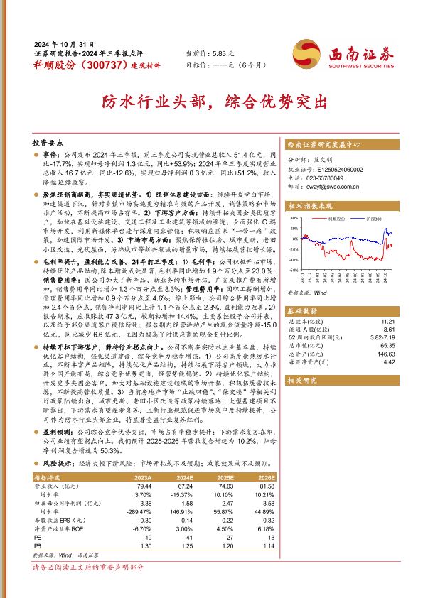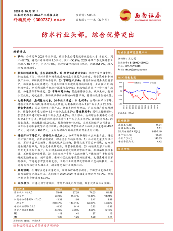 【西南证券】【20241031】科顺股份(300737)2024年三季报点评:防水行业头部,综合优势突出-11页