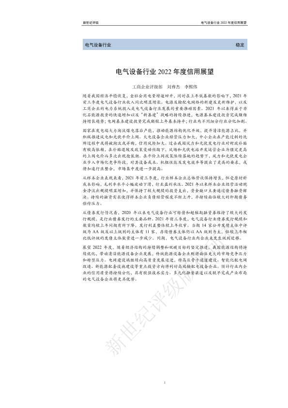 【新世纪评级】【20220101】电气设备行业2022年度信用展望-26页