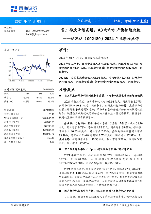 【国海证券】【20241105】纳思达(002180)2024年三季报点评:前三季度业绩高增,A3打印机产能持续爬坡-12页